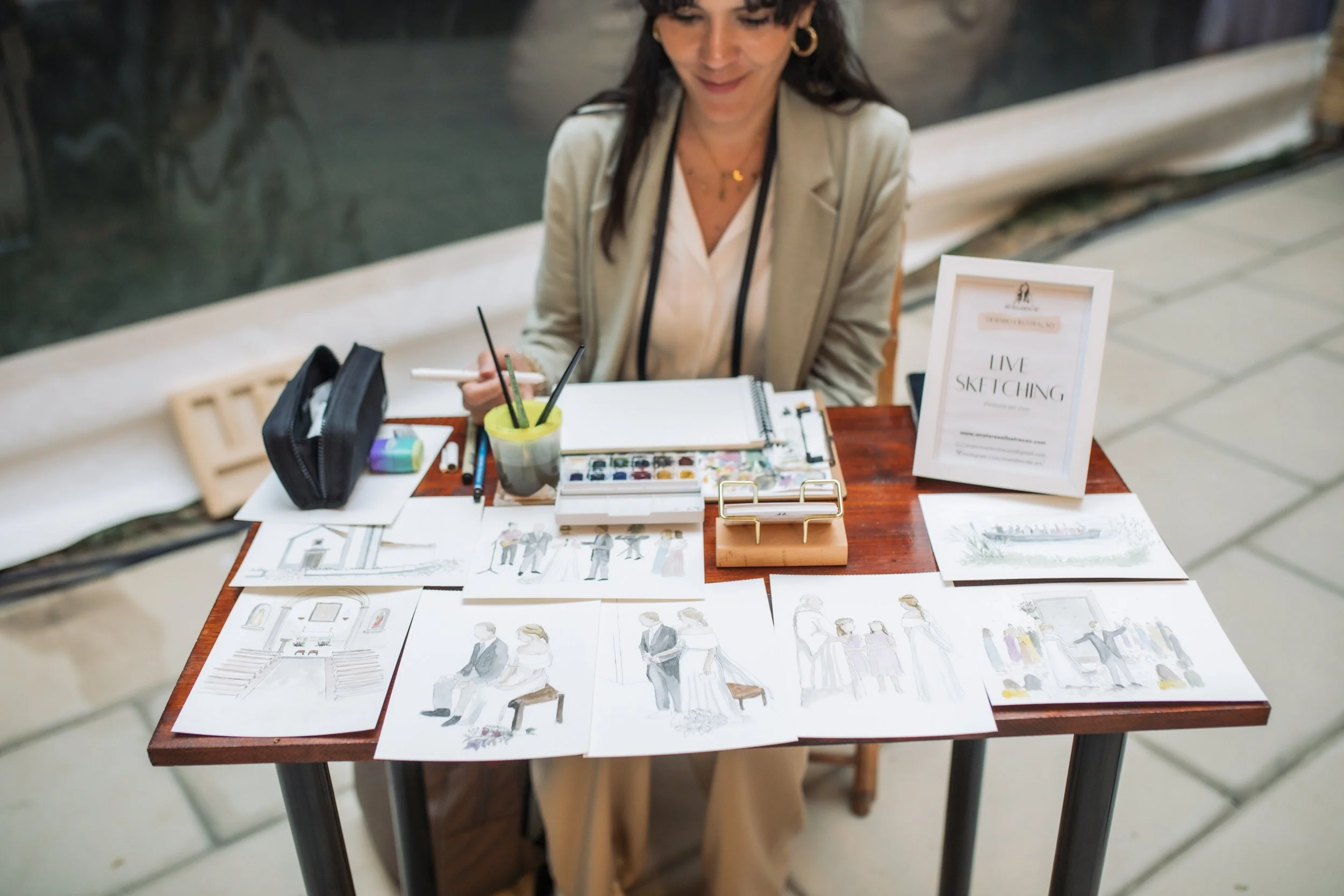 Live sketching refere-se ao ato de criar ilustrações em tempo real e ao vivo durante um evento. Tem como objetivo captar os melhores momentos do dia e transformá-los em aguarelas. O meu trabalho será criar essas representações, mais direcionadas para os noivos, e certificar-me de que ficarão com uma recordação muito especial.